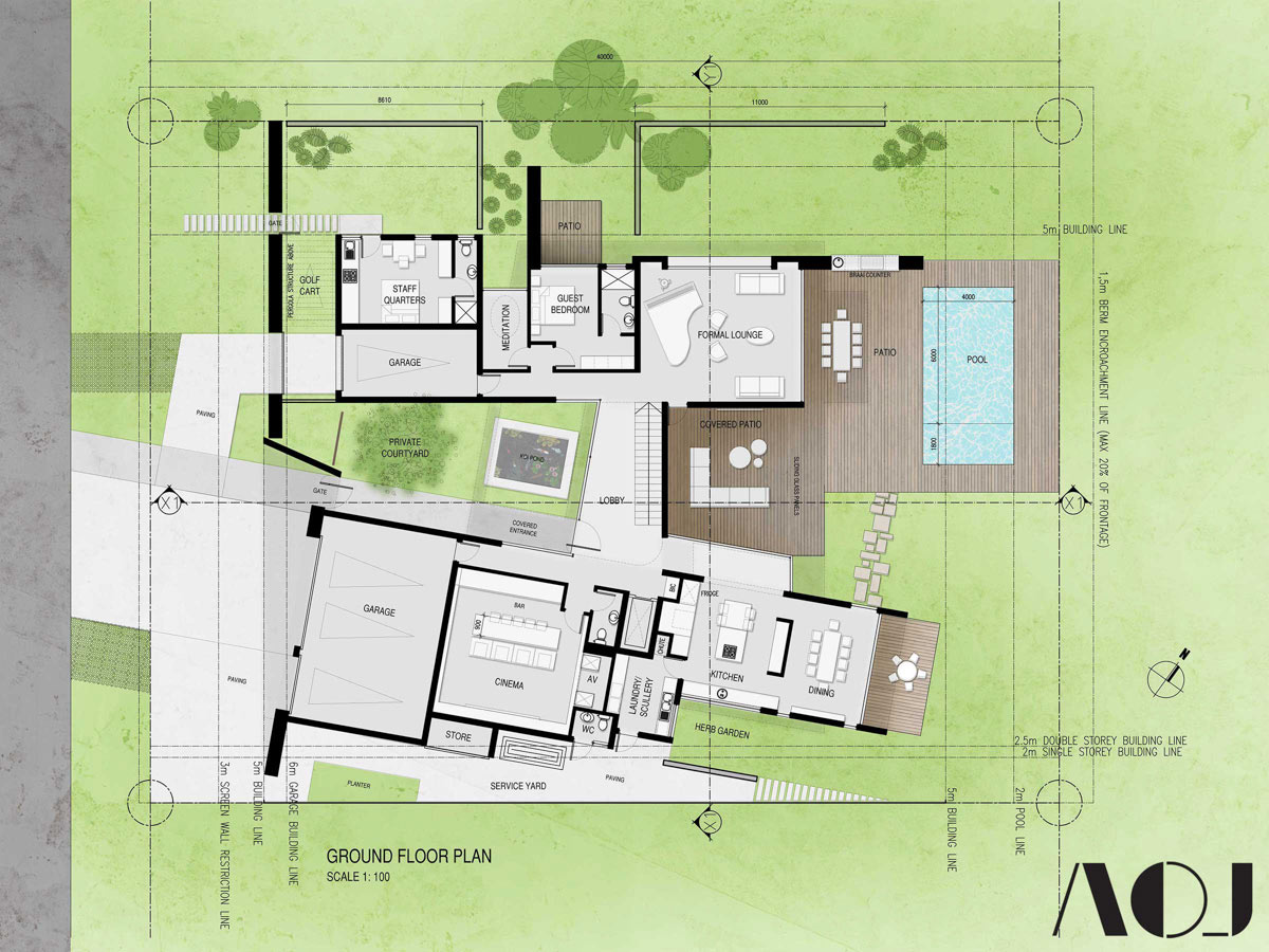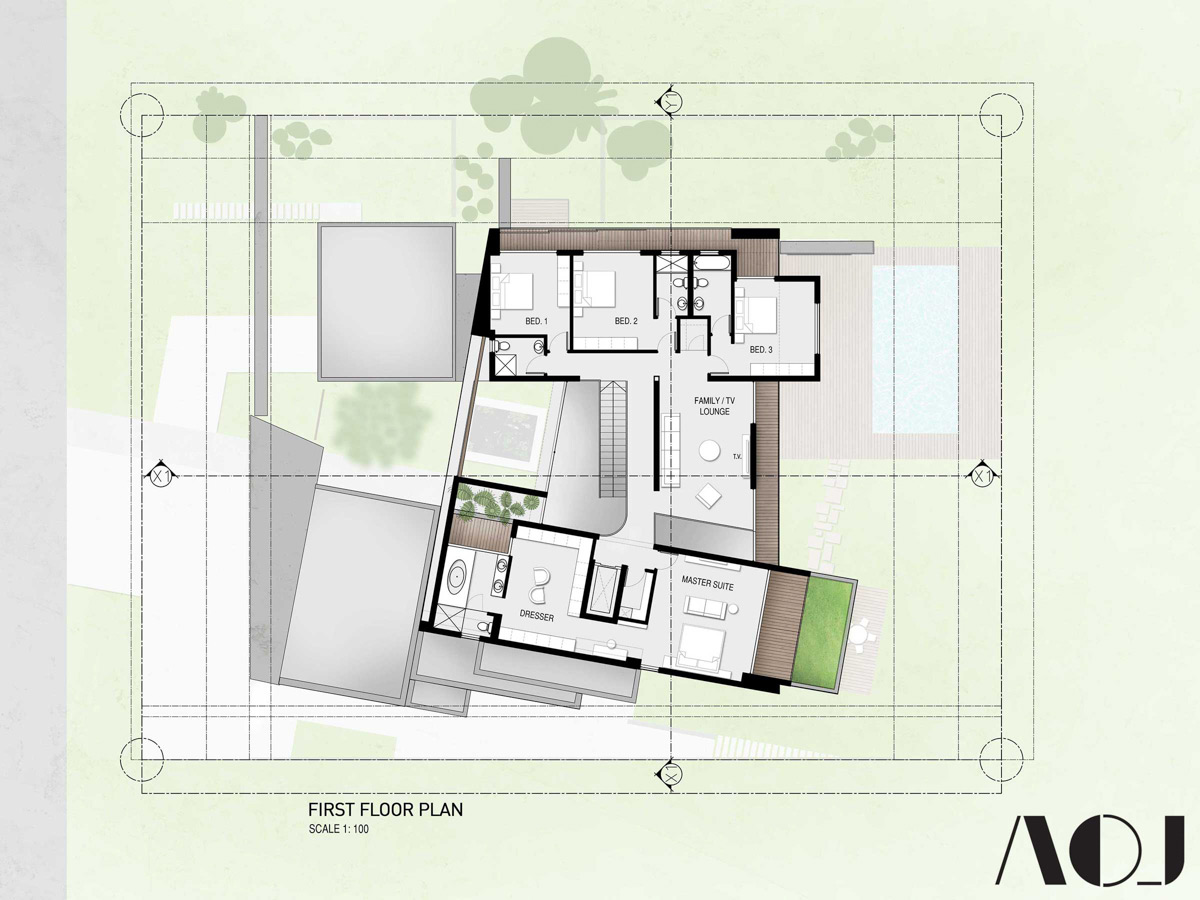 This strategically selected site, coupled with AOJ’s ability to organise the plan in what is essentially two wings, lets the design permeate nature, bringing natural light, air and vegetation deep into the interior, making this luxury house, the perfect fit to the client’s original brief.